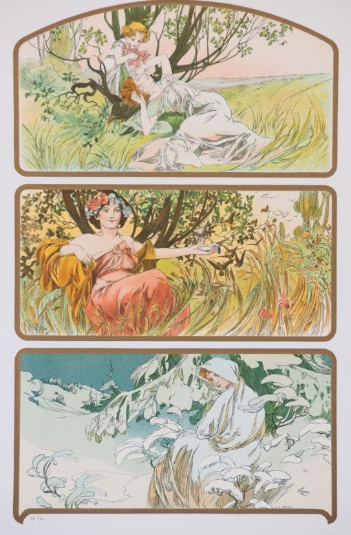 The seasons were thematic and beloved in many of Mucha‘s lithographs.  Summer, autumn and winter lounging by the same tree. Includes certificate of authenticity.