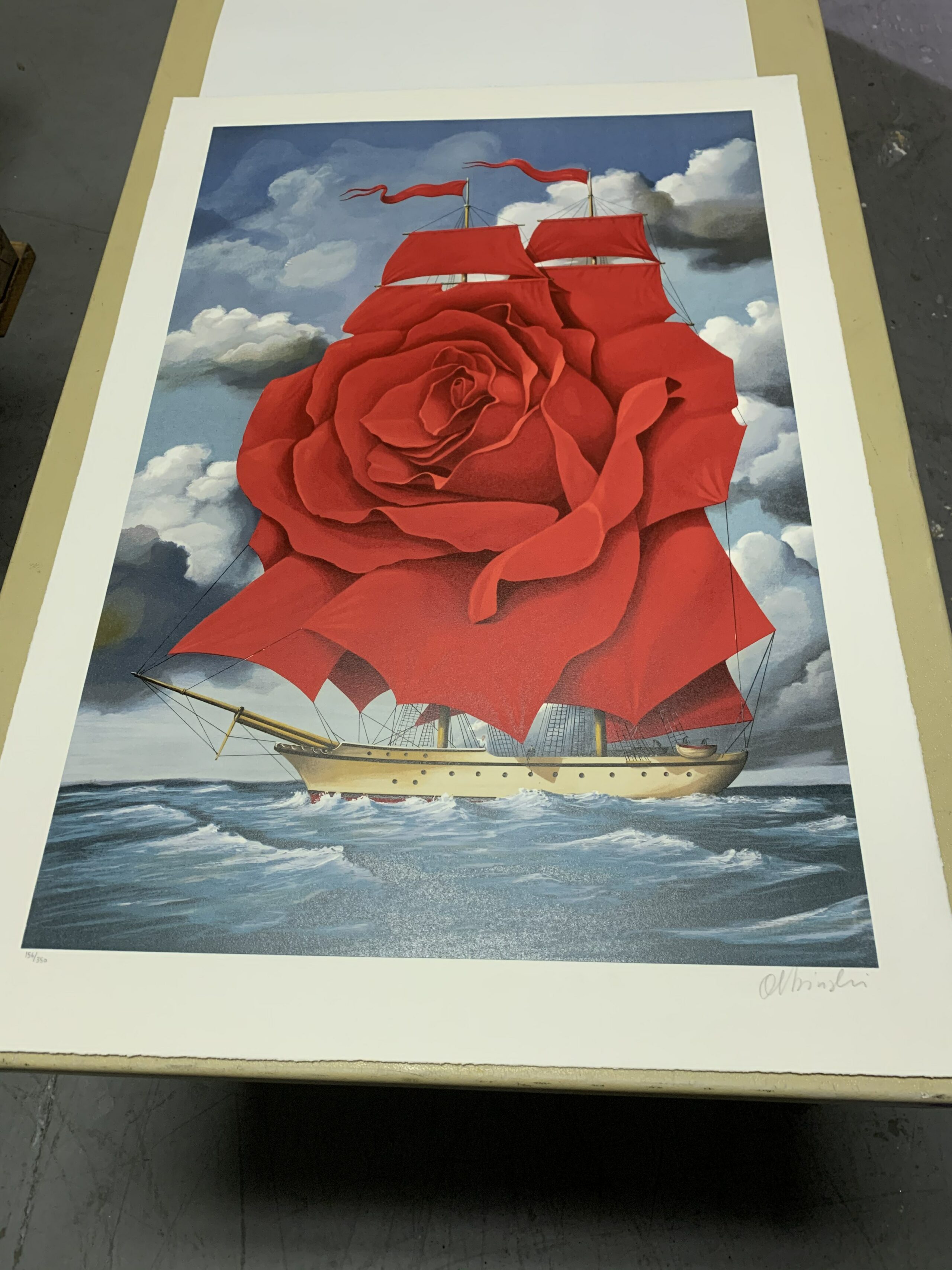 Rafal Olbinski was born in Poland. He graduated from the architecture program of the Warsaw Polytechnical School in 1969, and immigrated to the United States in 1981, where he soon established himself as a prominent painter, illustrator and designer. Olbinski’s work is very similar to the work of the famous Belgian surrealist Rene Magritte; Olbinski describes his approach to painting and illustrating as “poetic surrealism”. He has cited his influences as “everybody”, specifically Saul Steinberg, Milton Glaser, Marshall Arisman and Brad Holland. Includes certificate of authenticity.