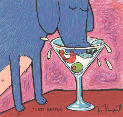 The image was originally created by Matt Rinard as an original gouache on watercolor paper. Mr. Rinard who, referring to the maquette, drew by hand the 16 separate plates from which this edition was pulled. “Dirty Martini” was printed at S2 Editions, Ltd. Atelier in 2006 on an antique French Marinoni Voirin flat bed press. Includes certificate of authenticity.
