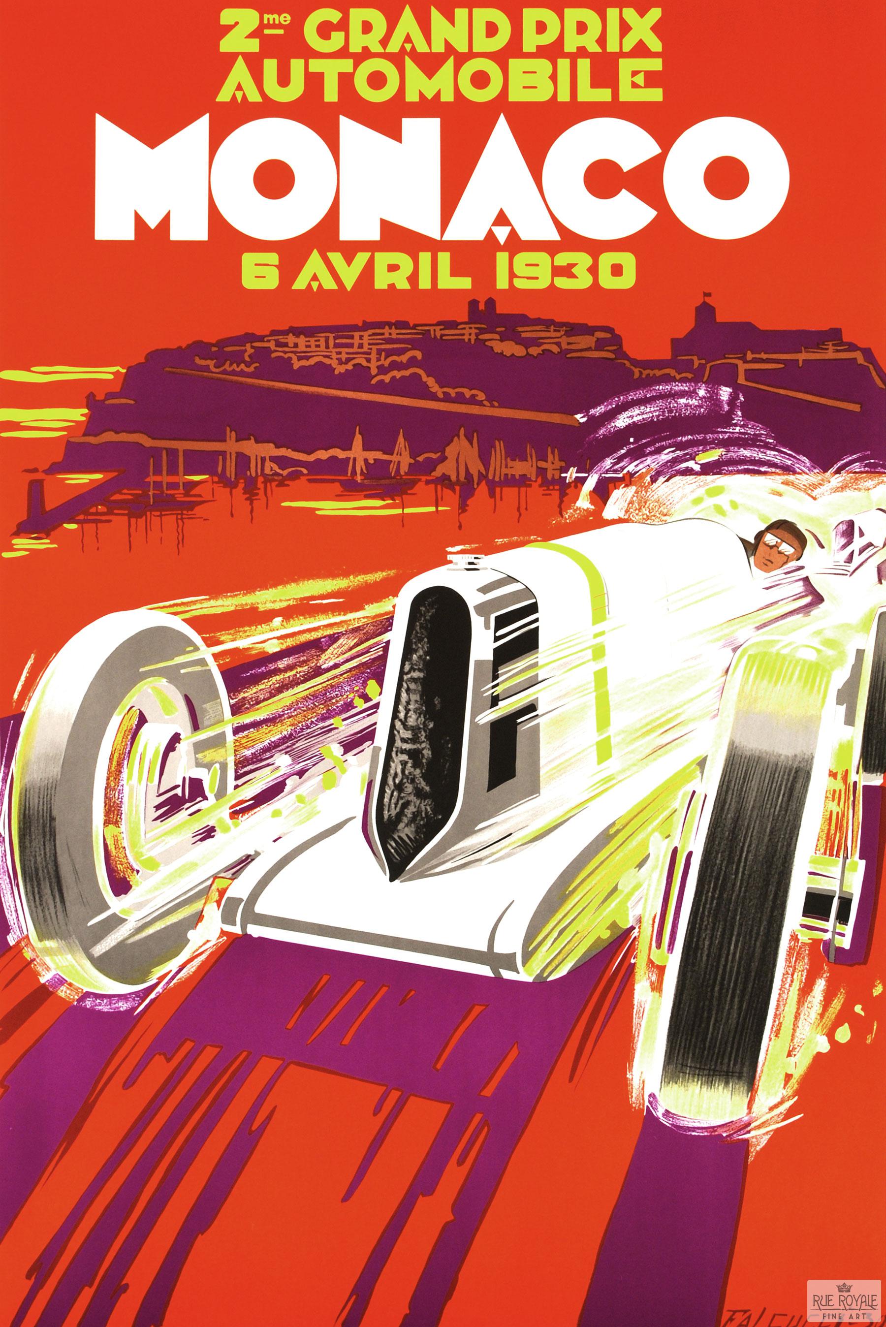 Vintage advertisement for the 2nd annual Monaco Grand Prix Auto racing in 1930 by artist Robert Falucci.  Hand-pulled on a vintage press in 1997. Includes certificate of authenticity.