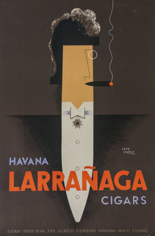 This poster was designed for the British firm of Larranaga, which was an importer of Havana cigars. This poster is considered one of Carlu’s best and has become one of the rarest. The Larranaga brand is still produced in Costa Rica from seeds from Havana.  The lithograph was recreated in 1997 on an antique press.